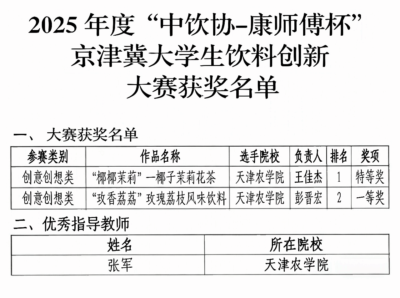 喜报!我校学子在2025年度“中饮协-康师傅杯”京津冀大学生饮料创新大赛中斩获多项大奖