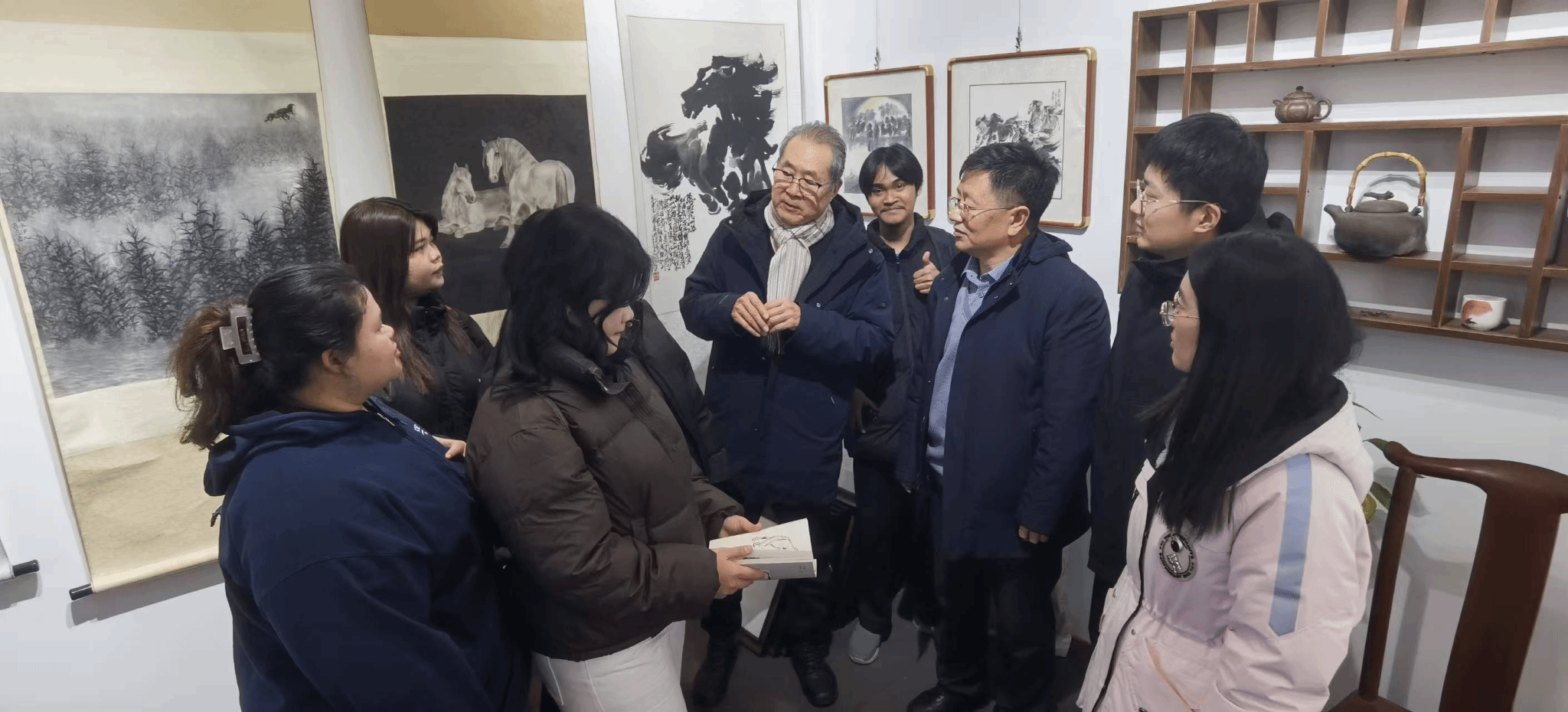 为喜迎马年新春,弘扬中华优秀传统文化,丰富“思源”文化内涵,创新校园文化建设思路,2025年12月29日,天津农学院食品科学与生物工程学院党委书记马铭启带领师生代表及5名泰国留学生,赴宫春虎水墨画马艺术中心,参观"喜迎马年,五代画马人马画艺术展",沉浸式感受水墨马画的艺术魅力与文化底蕴。