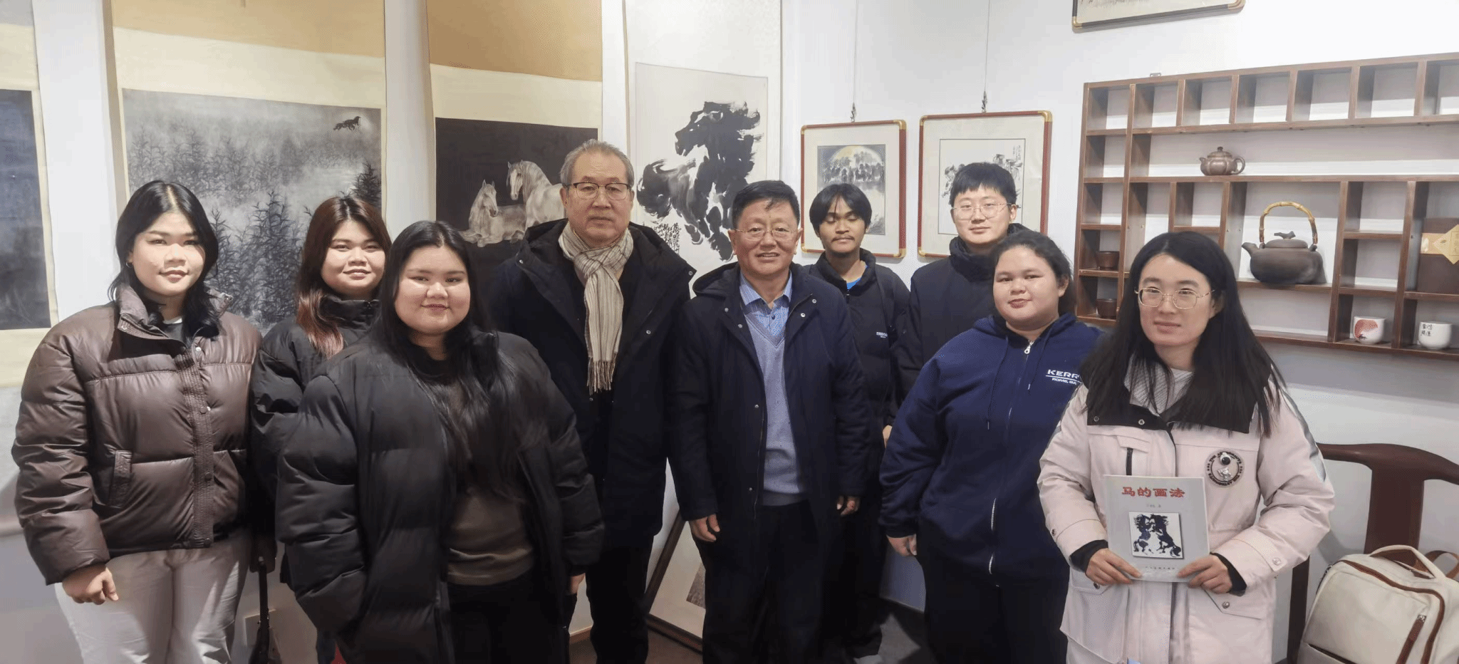 随后,师生们与宫春虎先生开展茶艺座谈。座谈中,宫春虎先生结合自身艺术经历,分享了其"移情"画马理论的创作理念——将情感与生命体验投射于马匹形象之中,使作品兼具形神之美与精神内核。他还向师生们介绍了徐悲鸿画马体系的艺术精髓,以及自己在传承传统技法基础上,对群马动态美学的探索与突破。泰国留学生们兴致盎然地询问画马技法与马文化寓意,现场交流氛围热烈,呈现出一派生动的中外文化交流场景。