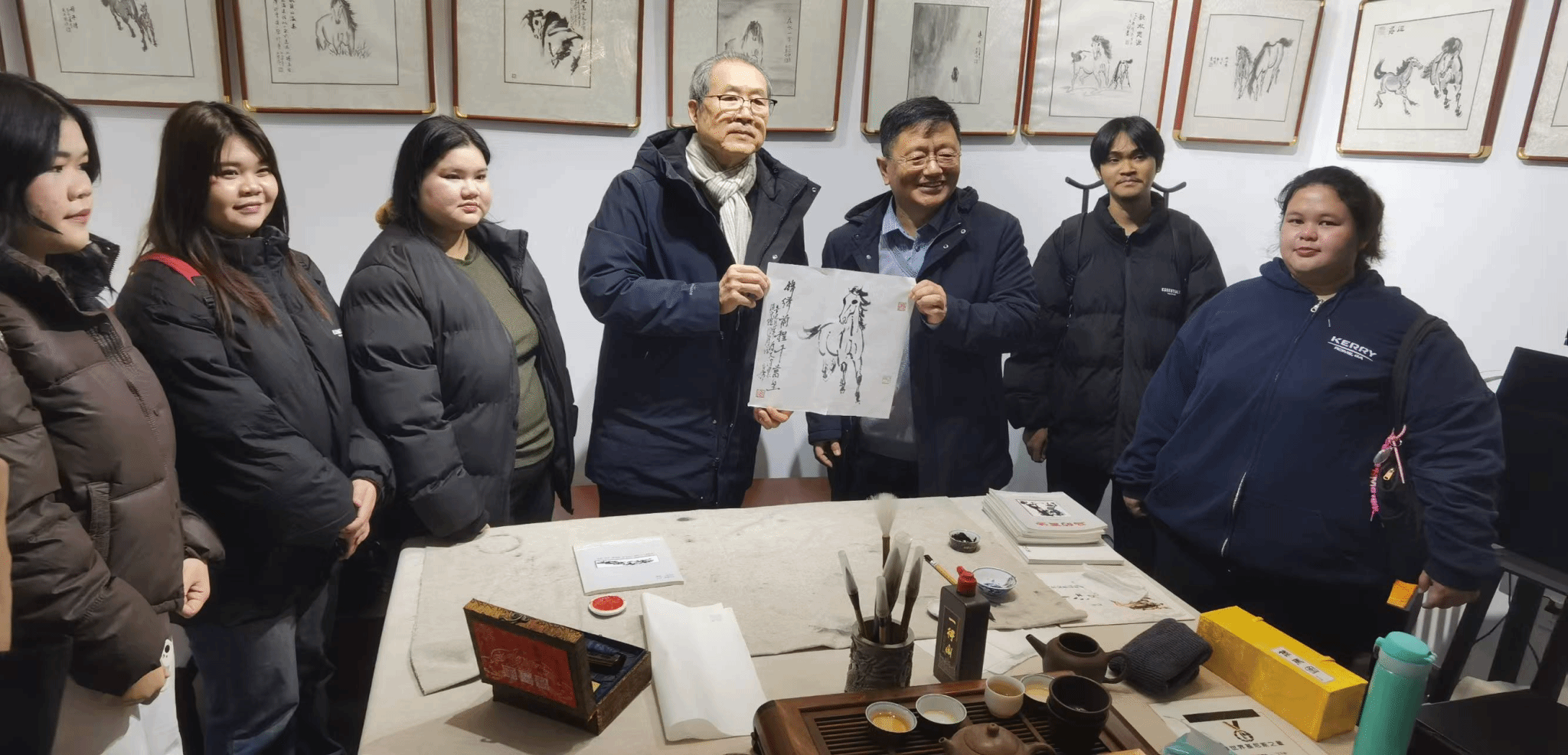 活动尾声,宫春虎先生为学院师生赠送墨宝,以马画作品传递对师生们的新春祝福与殷切期许。全体参与人员与宫春虎先生合影留念,为本次参观活动画上圆满句号。泰国留学生芳欣表示:“此次参观交流活动让我们感受到了中华传统文化的博大精深,当我将这些画作给我的泰国朋友展示时,他们都深感震撼并希望有机会也能亲身感受中国文化的魅力。”