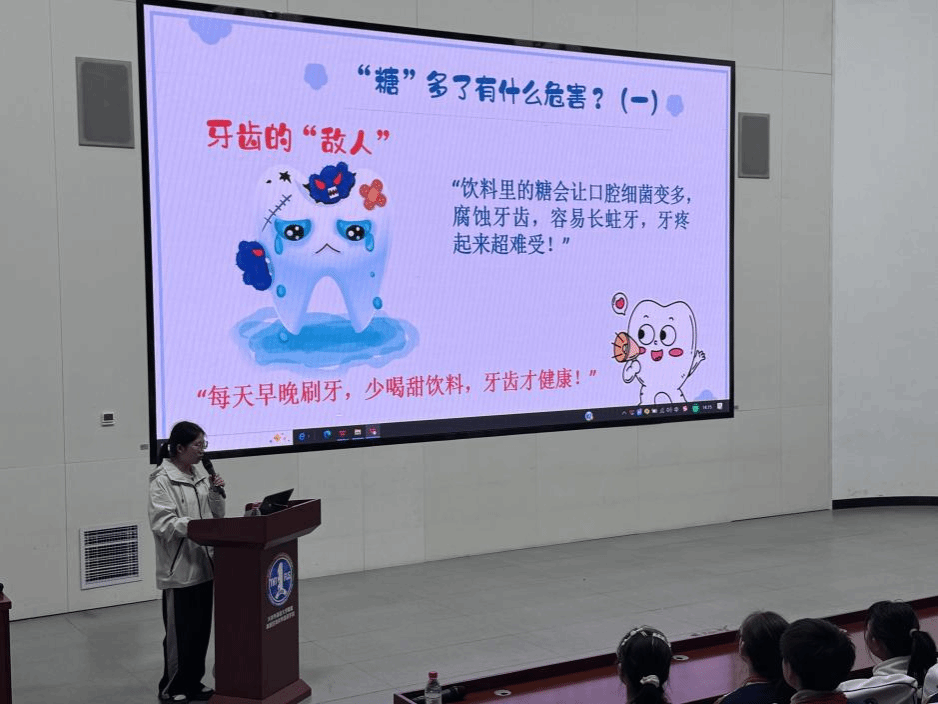 活动现场,科普内容贴近青少年生活实际,兼具知识性与趣味性。陆妍以青少年日常饮奶为切入点,用通俗易懂的语言细致讲解乳糖不耐受的形成原因,结合真实案例清晰区分“乳糖不耐受”与“牛奶过敏”的核心差异,并针对性分享少量多次饮用、搭配主食同食、选择零乳糖乳制品等实用应对技巧,有效纠正了学生“一喝牛奶拉肚子就终身不能喝奶”的认知误区。针对青少年普遍存在的“嗜糖”问题,马树玥精心设计“糖分大揭秘”互动环节,通过直观展示常见零食、饮料的含糖量数据,详细讲解过量摄入糖分对牙齿、骨骼发育及身体代谢系统的危害,引导学生主动关注饮食健康,养成低糖、科学的饮食习惯。